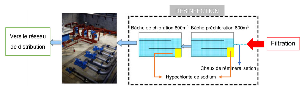 La désinfection est réalisée par la méthode de la chloration. Elle s’effectue à l’aide d’hypochlorite de sodium (eau de javel) en deux temps. Une première injection est faite dans la bâche de préchloration (contact chlore), puis une seconde dans la bâche eau traitée*.