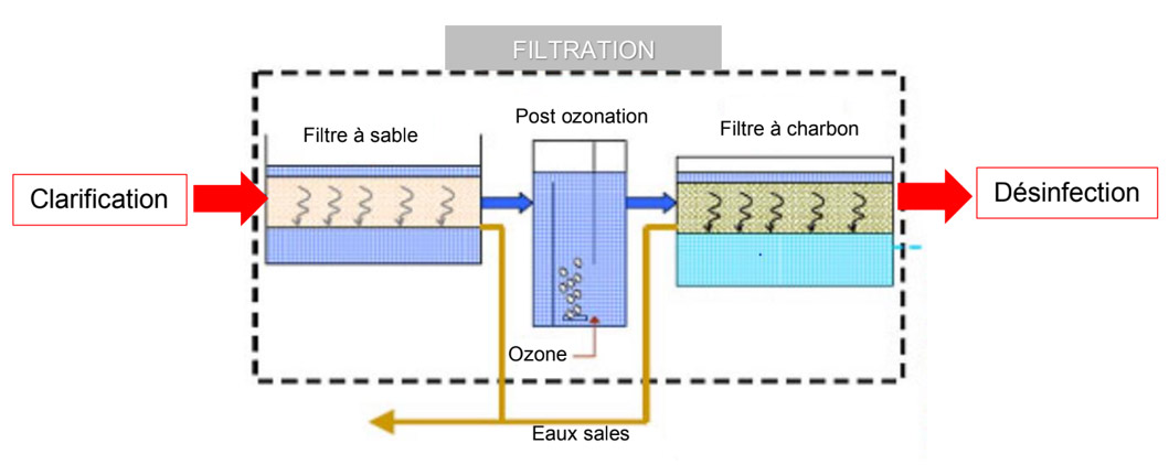 - Filtre à sable : l’usine est constituée de 4 filtres à sable qui vont retenir le reste de matières organiques et minérales.