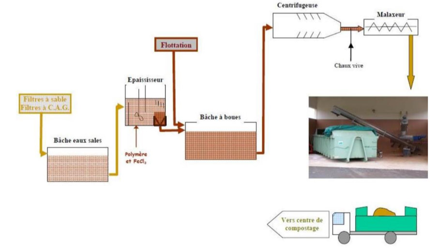 Les boues liquides issues des différentes étapes de la potabilisation de l’eau (raclage de la flottation, densadeg®*= traitement des eaux sales par filtration), sont récupérées dans une bâche de stockage de 350 m3. Les boues passent dans une centrifugeuse et sont mélangées à de la chaux vive afin de les déshydrater. Les boues solides ainsi obtenues sont transférées vers un centre de compostage.
