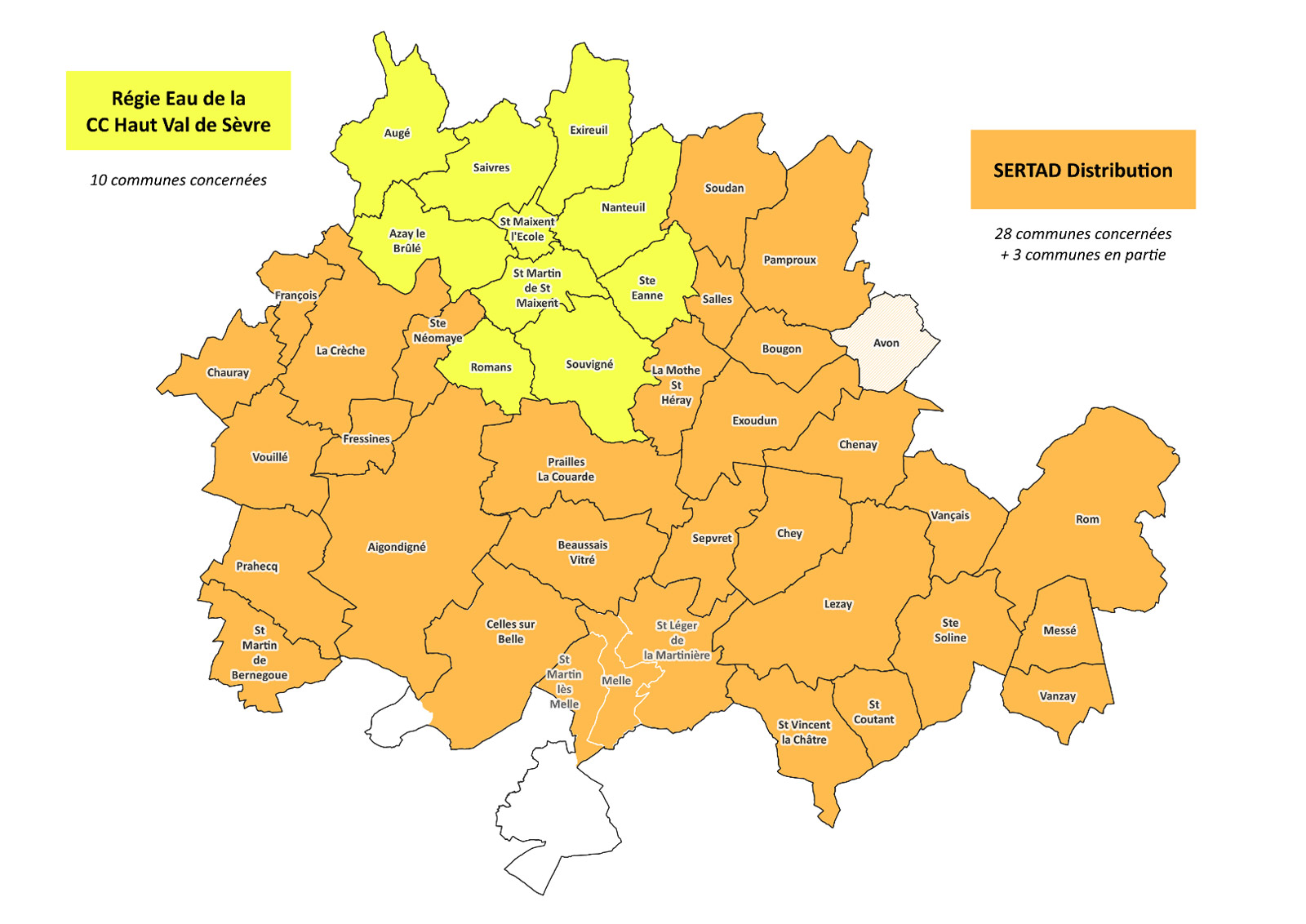Le syndicat dessert 31 communes soit environ 28 000 branchements ce qui représente un linéaire de réseau de 1 265 kms. Le SERTAD vend de l’eau traitée au syndicat 4B, à la Communauté de Communes Haut Val de Sèvre et à la Communauté d’Agglomération du Niortais. Il assure également un secours en cas de besoin pour le SECO et la Communauté d’agglomération du Niortais.