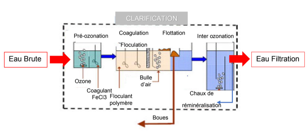 Cela consiste à enlever à l’eau brute, les éléments et particules en grande quantité. Pour obtenir l’eau clarifiée, plusieurs étapes sont nécessaires :