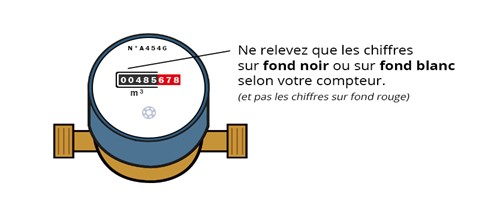 Seuls les chiffres blancs sur fond noir sont à prendre en compte. Ils constituent l’index que vous retrouverez sur votre facture, exprimé en m3. Les chiffres rouges sur fond blanc, ou blancs sur fond rouge indiquent le nombre de litres consommés et ne servent pas à la facturation.